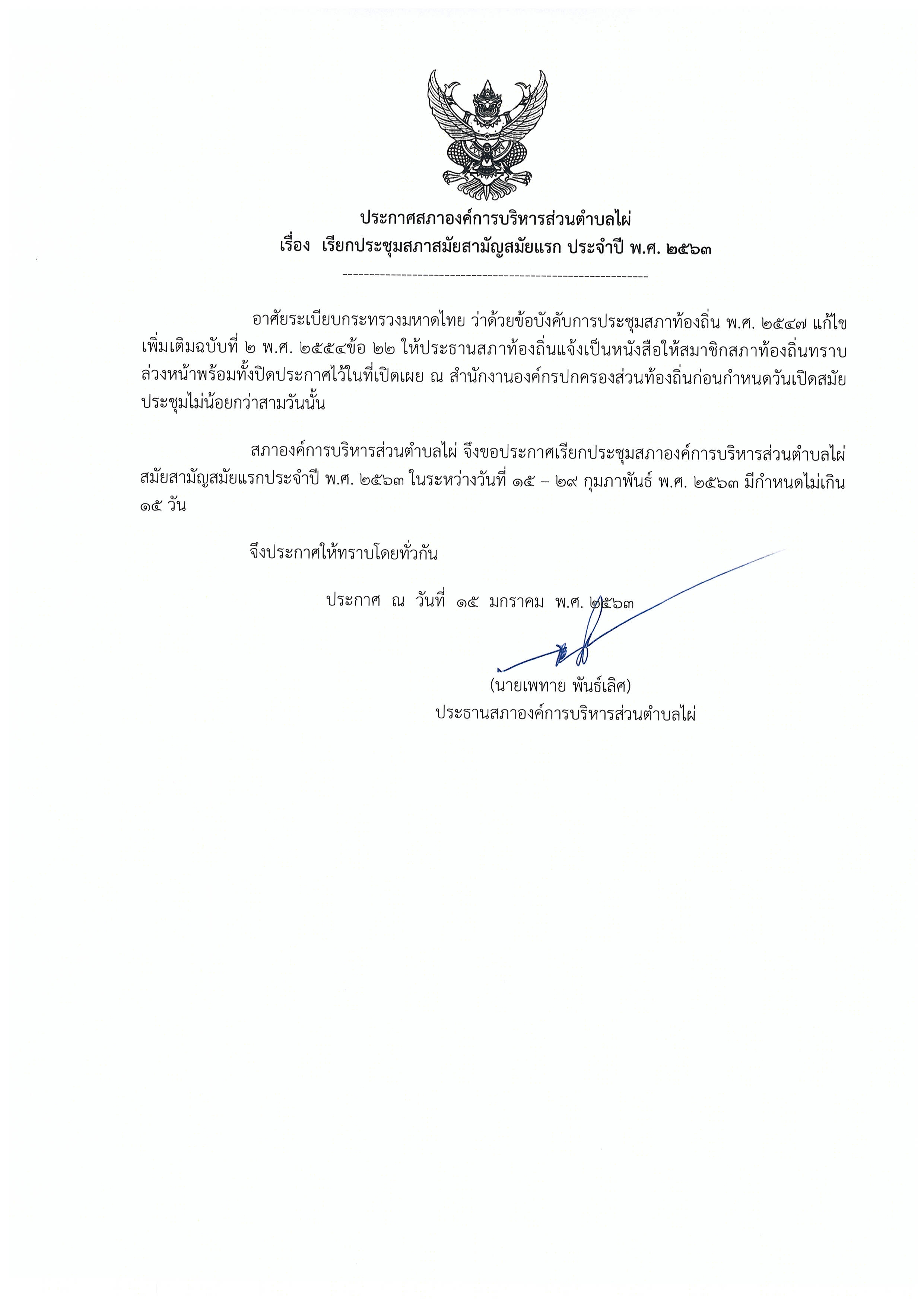 ประกาศสภาองค์การบริหารส่วนตำบลไผ่ เรียกประชุมสภาสมัยสามัญสมัยแรกประจำปี พ.ศ. 2563